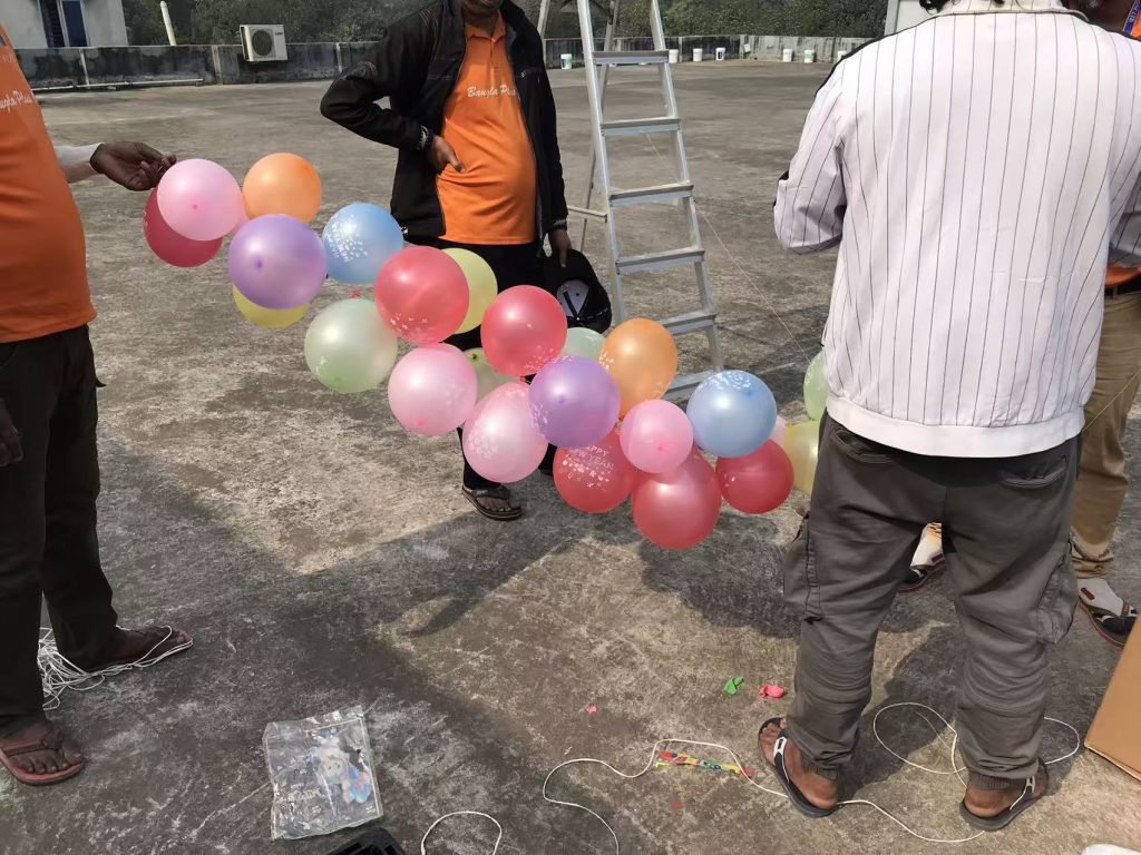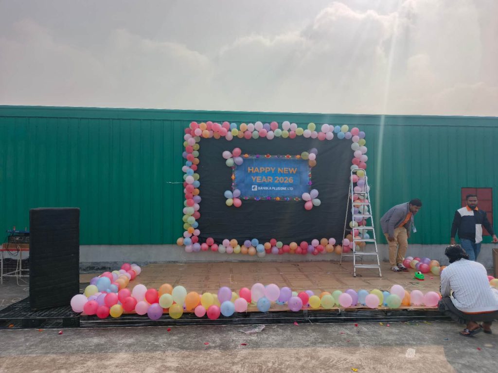 朝からステージを用意して、Happy New Year の風船を飾りました。